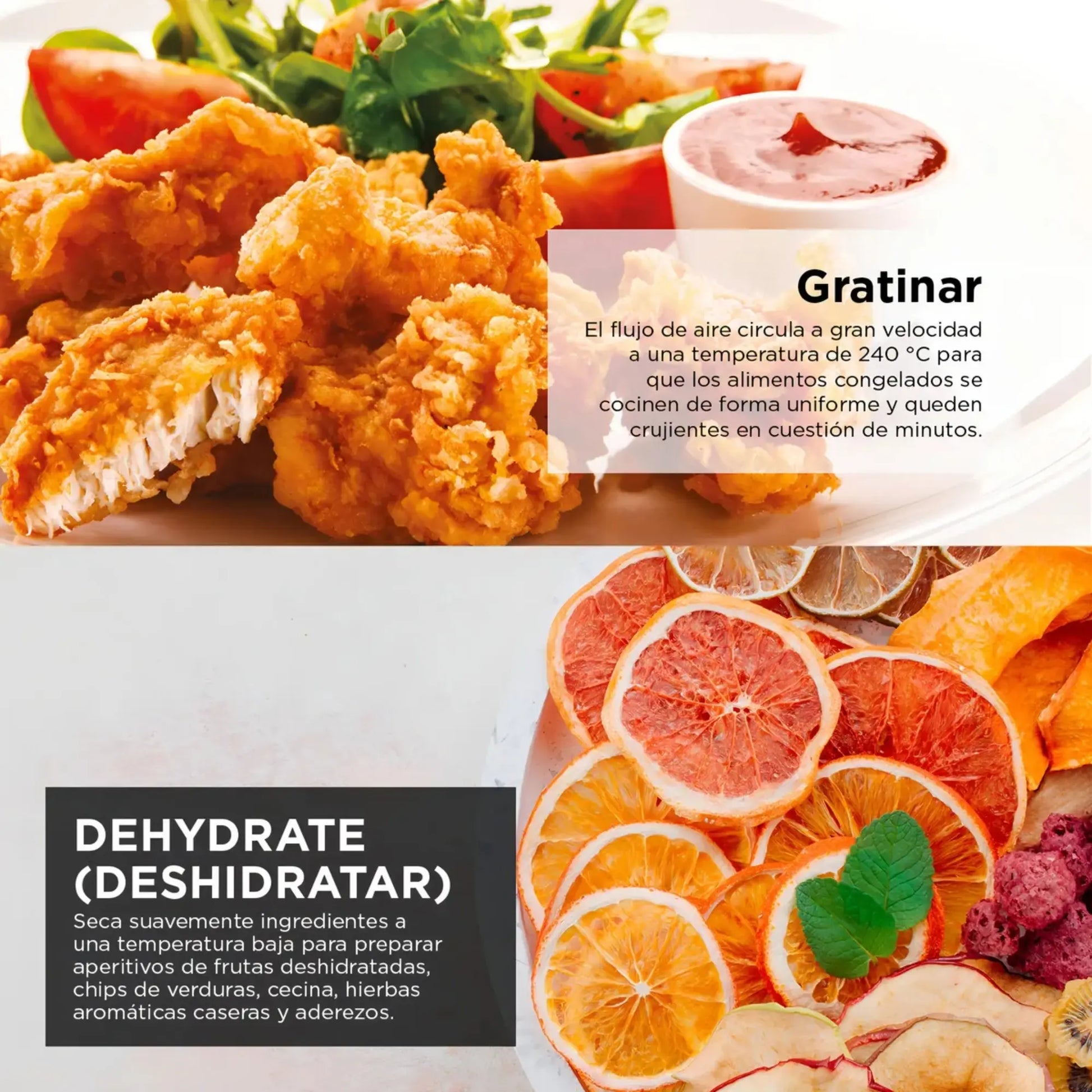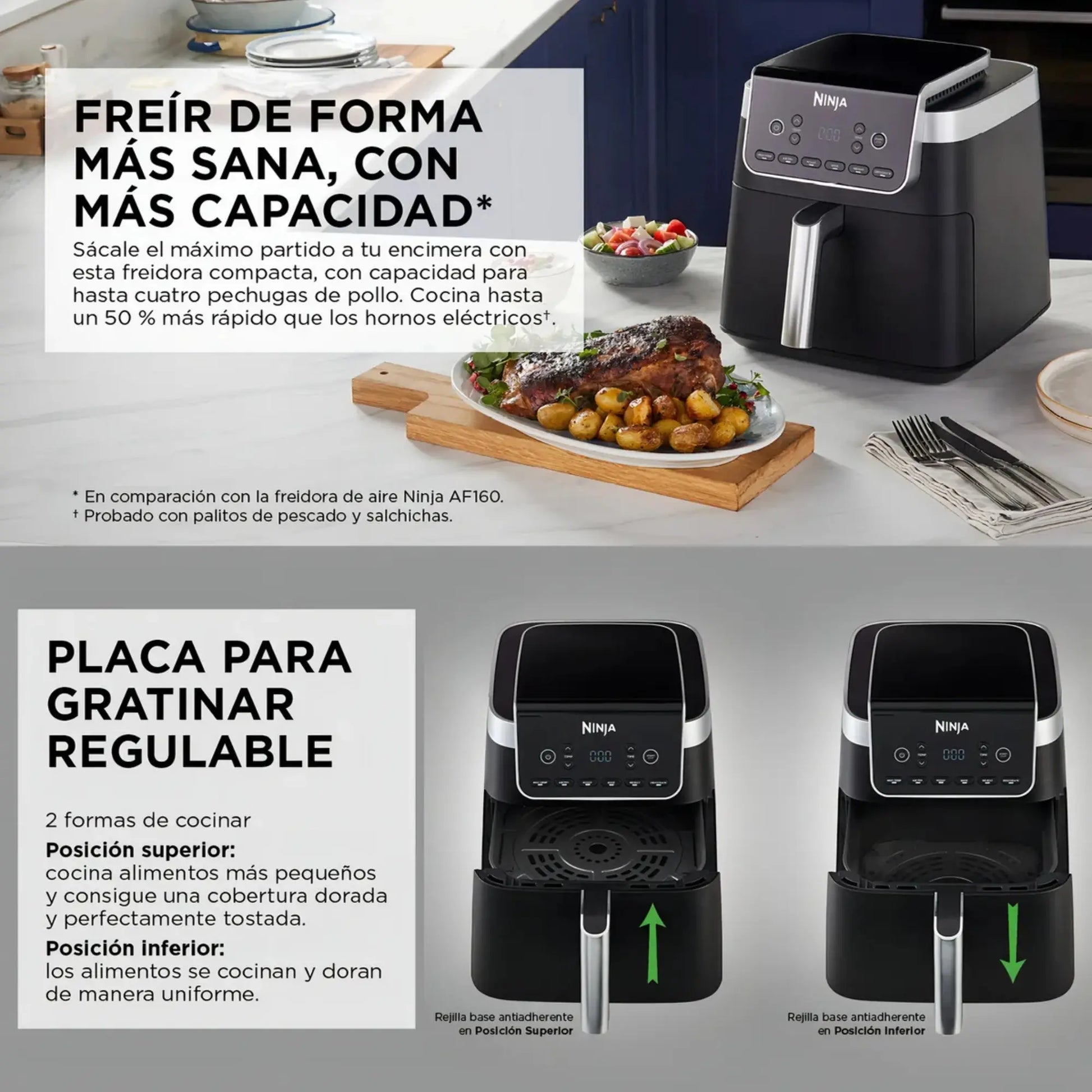 PLACA REGULABLE DE 2 POSICIONES: Inferior: para que alimentos como papas fritas, verduras y cortes de carne más grandes se cocinen de forma uniforme y queden crujientes. Superior: para alimentos más pequeños, como berenjenas asadas y tostadas con queso, y que queden con una cobertura dorada y perfectamente tostada.