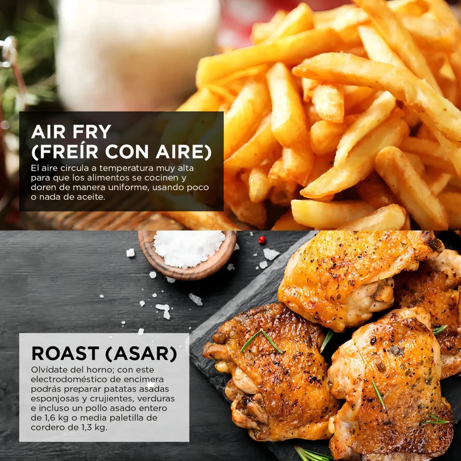- Roast: para asar sin encender el horno. Especial para papas y verduras asadas esponjosas y crujientes, carne de cerdo, carnes rojas e incluso un pollo entero de hasta 1,6 Kg